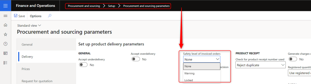 Setup: Procurement and sourcing> Setup> Procurement and sourcing parameters> Delivery> Safety level of invoiced orders