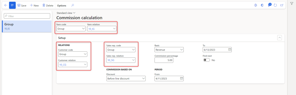 Navigate to Sales and marketing> Commissions>Commission calculation Create a new commission calculation and assign customer group, sales group and item group as highlighted below.